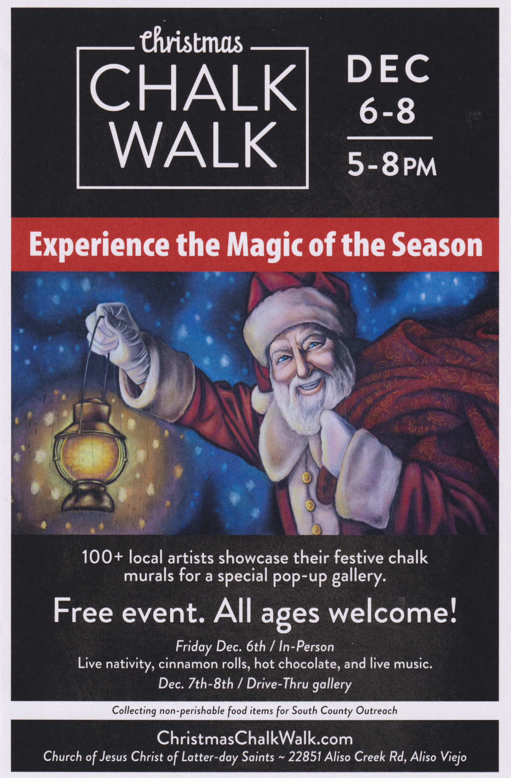 The Christmas Chalk Walk is a pop-up art gallery of over 100 chalk art murals created by local artists. Friday, December 6th is the in-person gallery with live entertainment, a live nativity (with animals!), and free hot cocoa and cinnamon rolls. On Saturday December, 7th and Sunday, December 8th, the gallery will become a drive-thru format for everyone to enjoy from the comfort of your car.